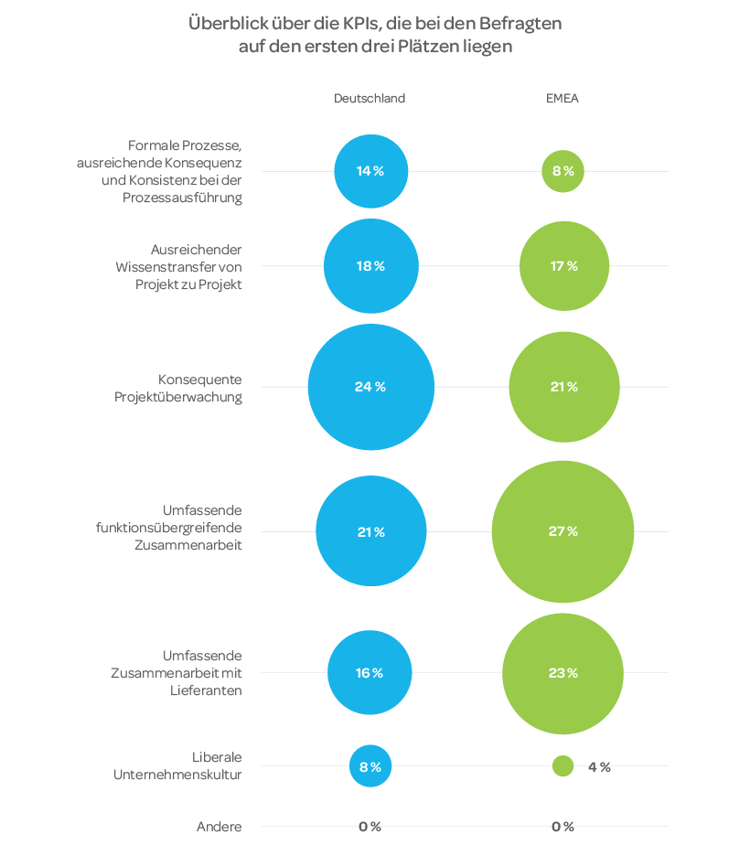 „Benchmarks & KPI“ werden im 4. Bereich der Studie beschrieben. Sie sind wesentliche Messwerte für die geschäftlichen Erfolge eines Unternehmens. KPIs (Key Performance Indicator) beschreiben, mit welchen Maßnahmen Unternehmen die Leistungen ihrer unterschiedlichen Geschäftsbereiche verbessern können. Die Liste reicht hier vom Nettoumsatz und der Rentabilität bis hin zur Kundenzufriedenheit und diversen Kostenvarianten. Benchmarks sind ein weiterer wesentlicher Faktor für die Erfolgsmessung und Positionierung.