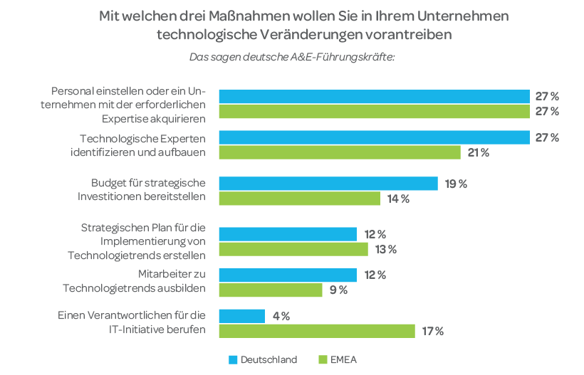 Bei der Frage nach ihrer Prognose für eine erfolgreiche Umsetzung der digitalen Transformation, zeichnen deutsche A&E-Unternehmen ein ehr positives Bild. Allerding sind die meisten von Ihnen der Ansicht, dass sie noch weiten Weg vor sich haben, bevor sie ein digitales Betriebsmodell etablieren können. Der Wille, die notwendigen Maßnahmen ergreifen, ist aber vorhanden. Die nachfolgende Grafik zeigt die geplanten Aktivitäten: