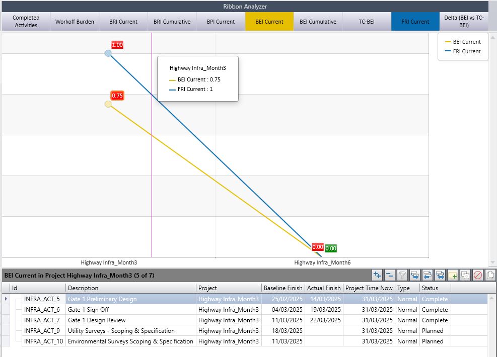 Acumen promotes schedule integrity as a fundamental element for successful project delivery. The introduction of Schedule Execution Metrics (SEM) as a default metric group allows users to assess the efficiency of the project delivery. Metrics such as the Baseline Realism Index (BRI) and Forecast Realism Index (FRI) highlight performance against what was initially agreed upon (Baseline) and assesses how realistic a project team’s expectations are on future completions and performance (Forecast).