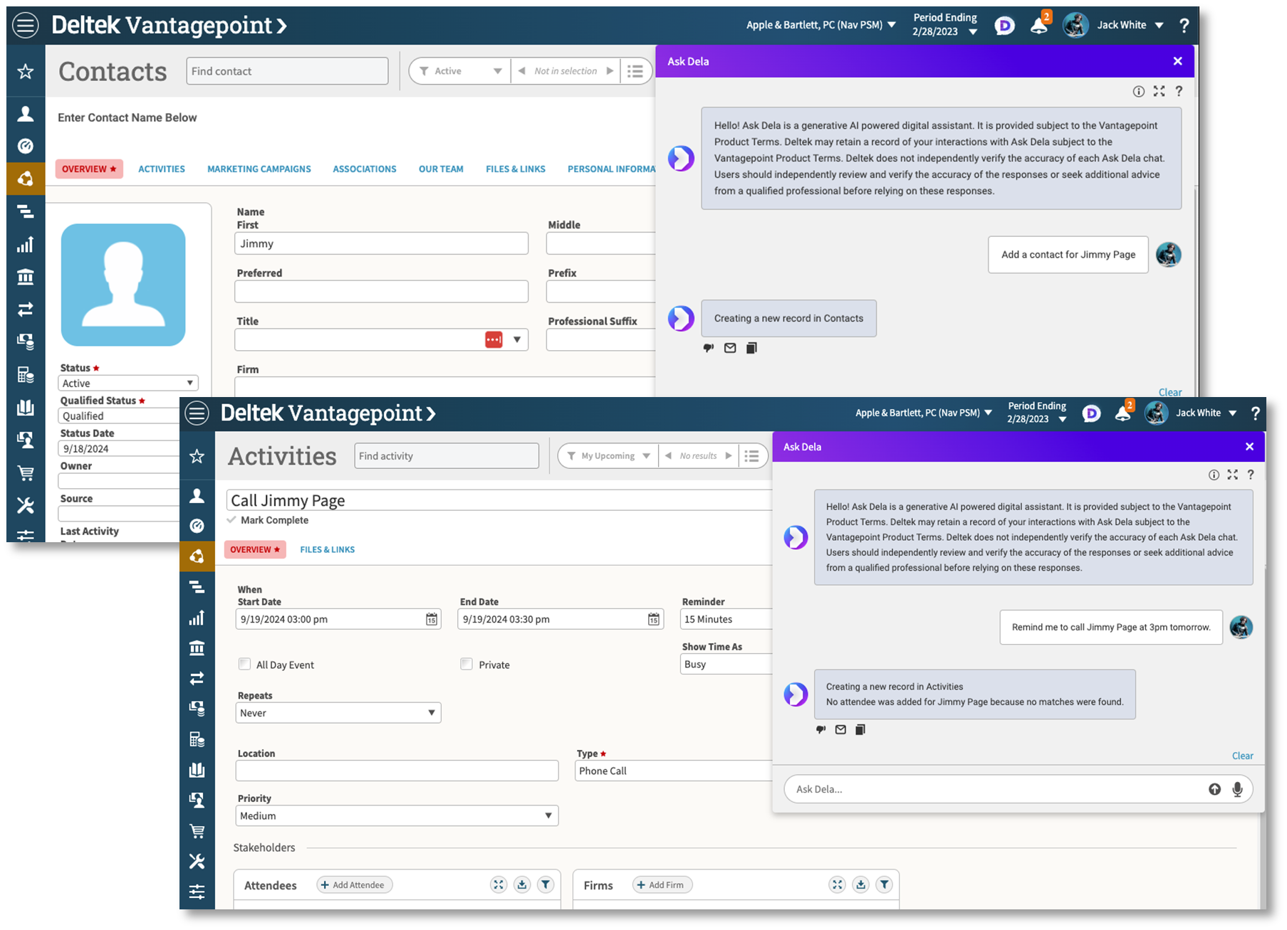Ask Dela, Deltek’s AI-powered digital assistant, now supports natural language prompts to create contact and activity records effortlessly. Managing your contacts and activities has never been easier. Whether you're capturing follow-up actions and reminders or adding a new client contact, Dela makes it quick and easy to make sure you never miss a connection opportunity.