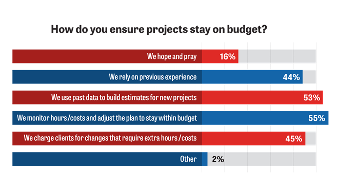 The most popular strategies for keeping projects on track both rely on good internal monitoring of operations. Over half (55%) of survey respondents were actively monitoring hours/costs spent, and adjusting their plans to ensure things stayed on budget. A similar number (53%) were using past data to build accurate