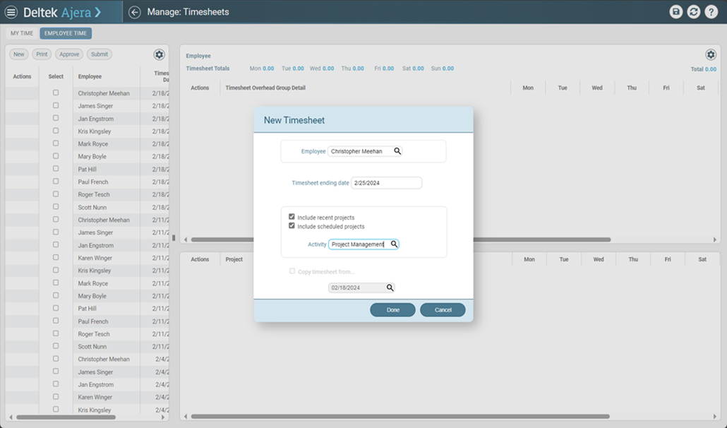 In 2024, Deltek Ajera introduced Timesheet Assist to help users create new timesheets quicker than ever before. Users can easily start a new timesheet pre-populated with recently used projects or projects already scheduled for the upcoming week. This handy shortcut reduces clicks and errors.