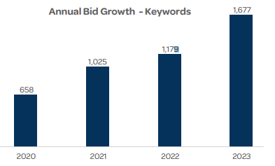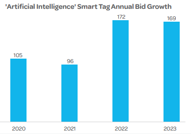Before the full report dives deeper into some of the detailed analysis, it begins with an overview of the last four full years showcasing AI growth within bid documents based on keyword search and Smart Tag data. By analyzing AI bids using the keyword search method from 2020 to 2023, we observed modest growth for the first three years. However, 2023 experienced a notable 42% increase in bids. This surge meant SLED governments enhanced their understanding of generative AI, aiming for greater transparency and better insights into vendor submissions, as well as to request specific AI products and services.