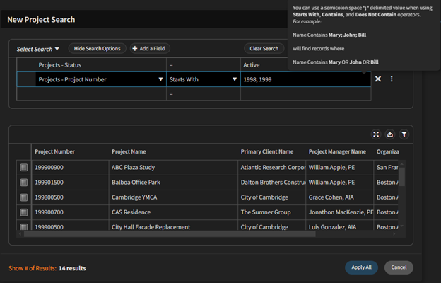 We’ve all been there—searching for that one piece of information, but not quite sure how to create the right search. Now in Vantagepoint, users can filter to key project data more easily by searching with “starts with,” “contains,” “does not contain,” and “this, next, and last year.” These enhanced search capabilities make finding what you need faster and easier than ever.