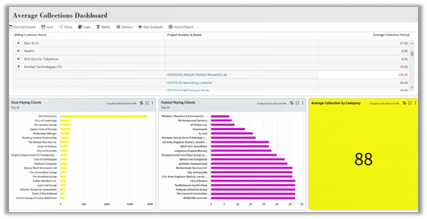 Cash flow is the lifeblood of any business, and now you can monitor it more effectively with dashboards highlighting Average Collection Period by Project. This gives you insights into how long it takes to collect payments on a project-by-project basis and better identify slow-paying clients, allowing you to spot issues and take corrective action quickly.