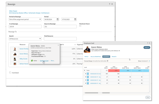 Managing team capacity just got easier. When project tasks or workloads need to be assigned or reassigned, PMs can now access the employee card from the add assignment and reassignment screens and view other project assignments quickly, eliminating extra clicks and screens. PMs can see exactly who has bandwidth for more work. This ensures that your projects are staffed efficiently without overloading your team.