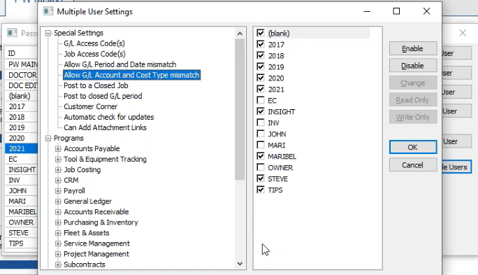 The same concept applies to the cost type mismatch allowance. You will be able to determine who, if anyone, has the option to post invoicing for non-default cost type within the system. Logically, this would make sense to not have as an allowance for any user in order for your books to stay balanced; however, by checking this allowance for someone, it allows them the subsequent option on the Special Settings list to post to a closed job.