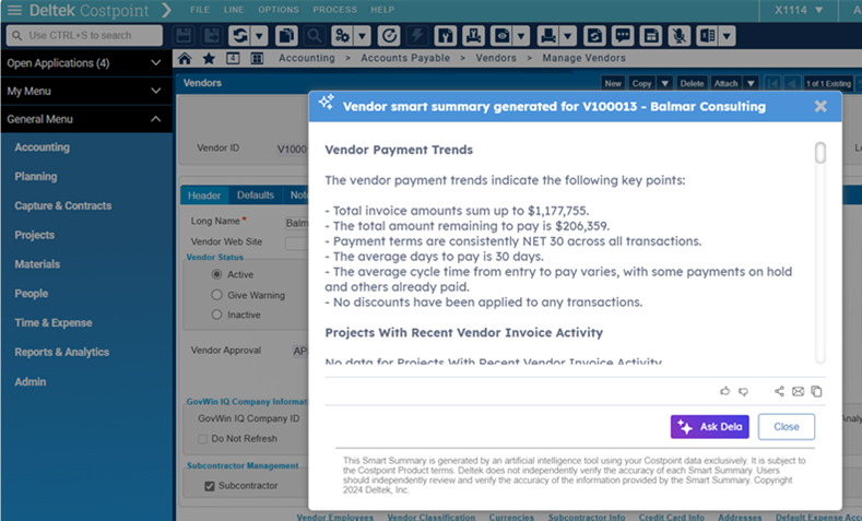 Originally released in 2024 for Contracts, Dela-enabled Smart Summaries process vast amounts of information in Costpoint to summarize details quickly - eliminating the need to manually search for, pull and compile data from multiple locations. This summary can then be generated into an email or used in meetings to provide quick status reports. With the 2025.2 release comes three additional Smart Summaries for Vendors, Customers and Employees.