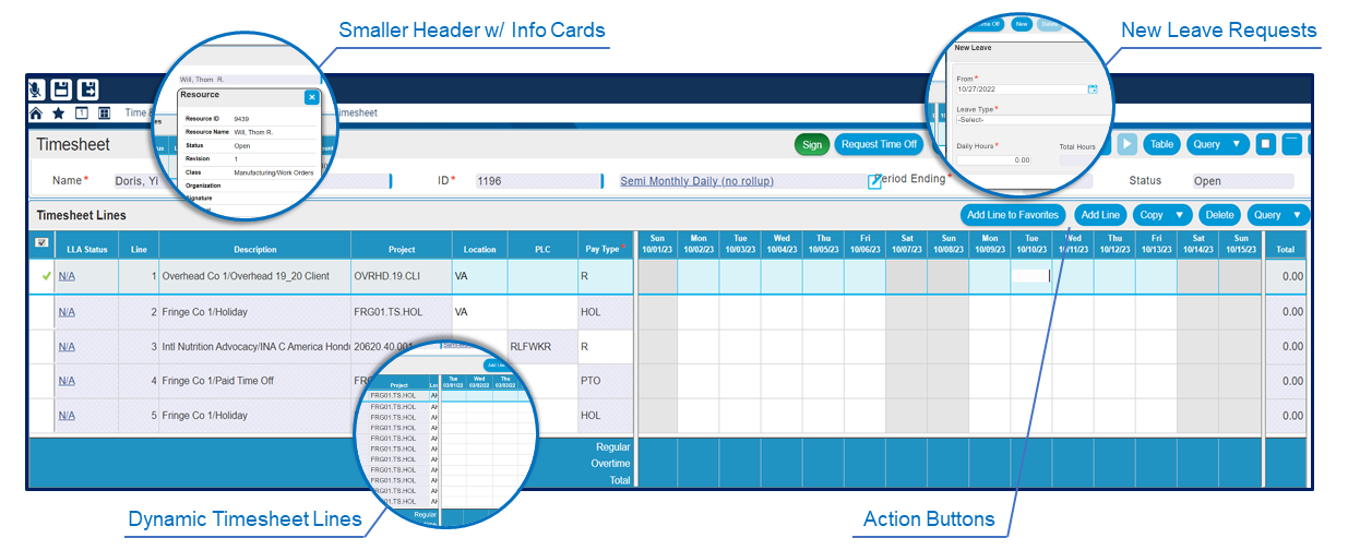- Clean and Consolidated Headers - When opening your timesheet, you'll see better optimization of screen real estate with more detailed information hidden and accessible through hoover-over info cards.
