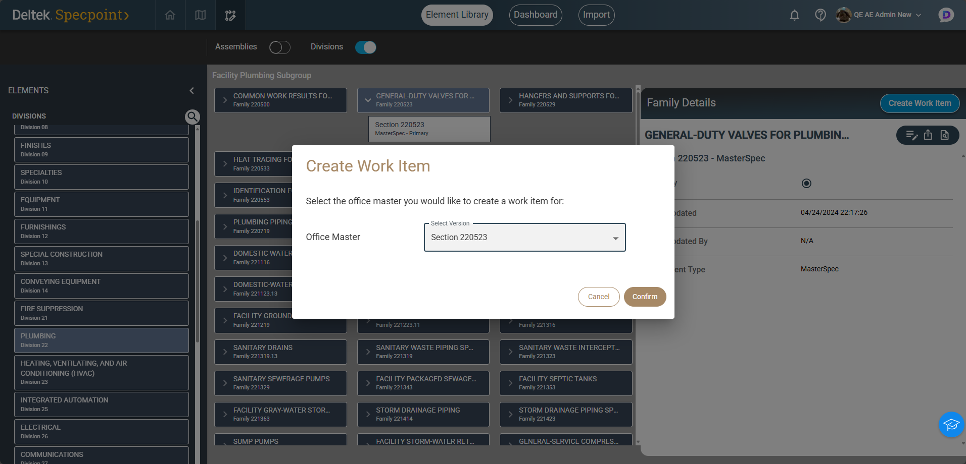 Choose the MasterSpec section to create a work item, customize project specifications, and take full advantage of Specpoint’s functionality.