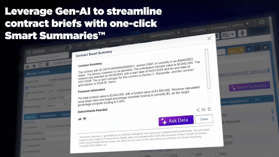 Deltek’s story begins in the government contracting industry, and we’ve continued our commitment to supporting this industry for more than 40 years because we believe that when government contractors have the right technology to make their lifecycles smarter and more efficient, we all benefit. As you embrace the power of AI to transform your business, we will continue to invest in bringing you the latest innovations that enable you to unlock your potential for growth.