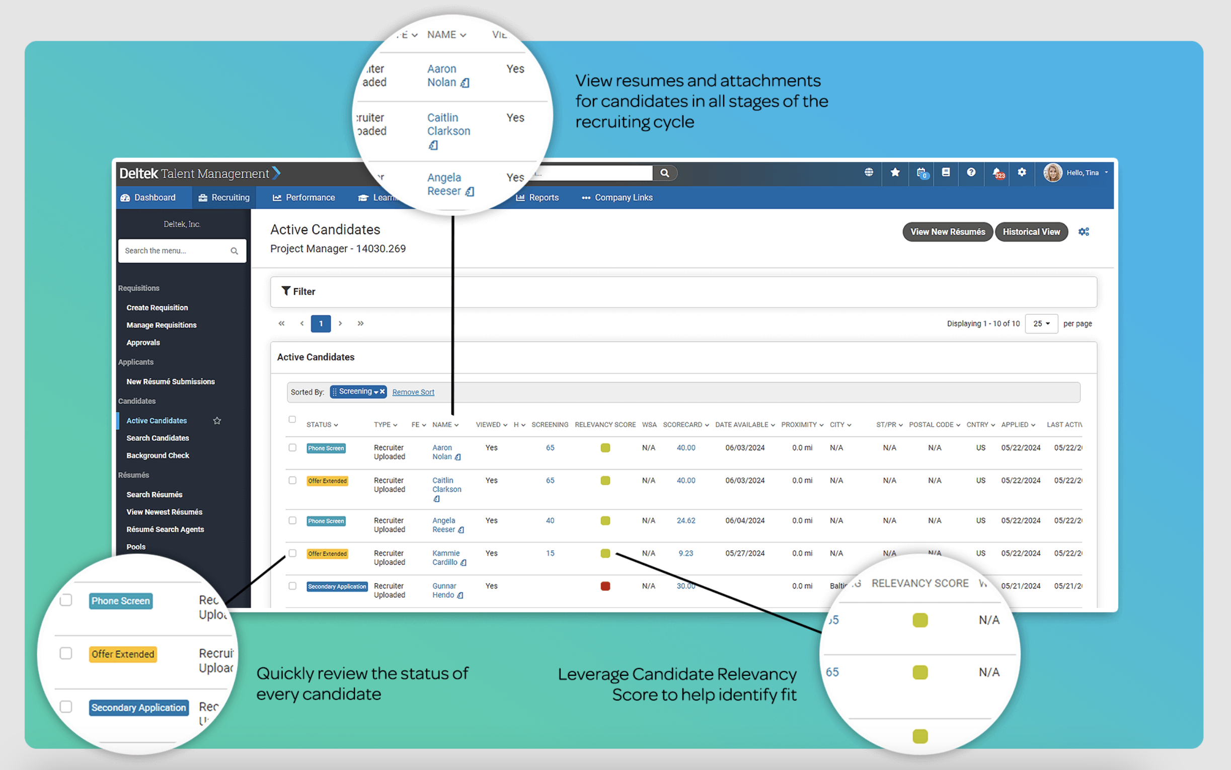 With the Candidate Relevancy Score feature in Deltek Talent Management, AI-generated resume scoring helps recruiters predict if an applicant is a good fit for a requisition that can be automatically created from Costpoint. This seamless connection between Talent Management and Costpoint then allows you to put newly hired staff on billable projects faster. Once you've filled the gaps, AI-drafted learning paths and AI-supported performance reviews help you retain top talent by providing ongoing development and feedback.