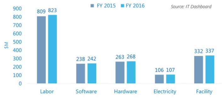 The DoD says it costs an average of $1.75B each year to run its 3,000+ data centers. That spending breaks down as follows for fiscal years 2015 and 2016, according to the IT Dashboard.