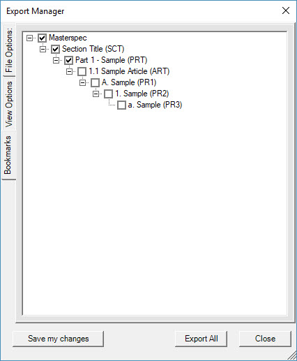 - The Bookmarks tab is now available in Export Manager. You can now use the options on this tab to enable or disable bookmarks in your exported files. To enable bookmarks, you must configure the level of content for each section, such as the Section Title (SCT) or Part 1 – Sample (PRT) for MasterSpec, for which to include bookmarks. You can enable bookmarks for exported files of projects that use a MasterSpec or UFGS master. By default, bookmarks for SCT, SCN, and PRT are enabled.