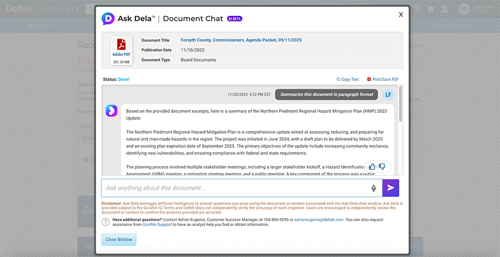 Every document is searchable with Ask Dela™, tagged with meeting details, and connected to the agency profiles you're already tracking. Set up keyword alerts for "fleet" or "infrastructure" or "contract renewal"—whatever matters to your business—and get notified the moment those topics appear in meeting discussions.