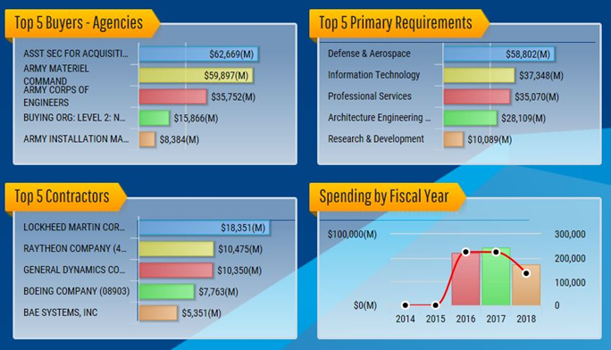 Users of the new tool can gain a birds-eye view by evaluating the landscape for their organization’s offerings in real-time with new search options that make it easy to discover relevant contract awards, and visualizing their specific markets with interactive infographics that highlight purchasing trends and top buyers/incumbents for their products or services.