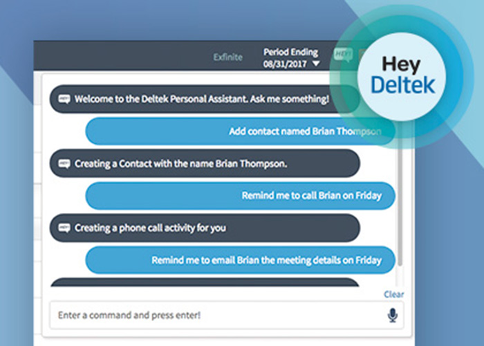 Hey Deltek was built on these beliefs and that is why the first version allows user to complete basic tasks by talking to the system or typing in an IM like chat window accessible from anywhere within Vantagepoint. Some of the use cases we focused on were allowing a user to open any hub record, create any hub record and easily add reminders.