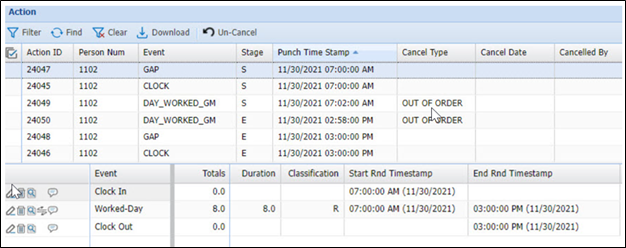 Out of Order punches will be placed into the action table and updated accordingly on the timecard