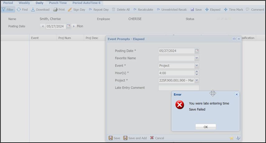 When an elapsed employee attempts to add hours for the previous day, a comment is required. If there is no comment, the transaction will not save