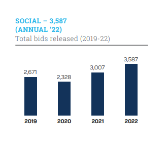 DE&I (diversity, equity and inclusion) initiatives continue to rise across governments. There is growth in abuse protection services as a result of governments responding to higher rates of problems and crimes, and mental health has been an increasing priority for governments since 2020. The pandemic also impacted youth and the workforce, resulting in a greater focus on disadvantaged youth services and workforce development programs. Overall, these social trends grew by 20.2% between 2021 and 2022, as the below chart shows.