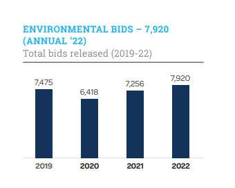 The below chart highlights environmental bids between 2019 and 2022. Deltek analysts have found several consistent themes where governments are mitigating the severity of climate change through a variety of services, and noted them in their State and Local Procurement Snapshot for Q2 2023 report. Of those themes, there is a stronger emphasis on investing in renewable and more efficient energy. Finally, to protect water from contamination and overuse there is the need to manage and monitor water resources. Overall, these environmental trends grew by 9.2% between 2021 and 2022.
