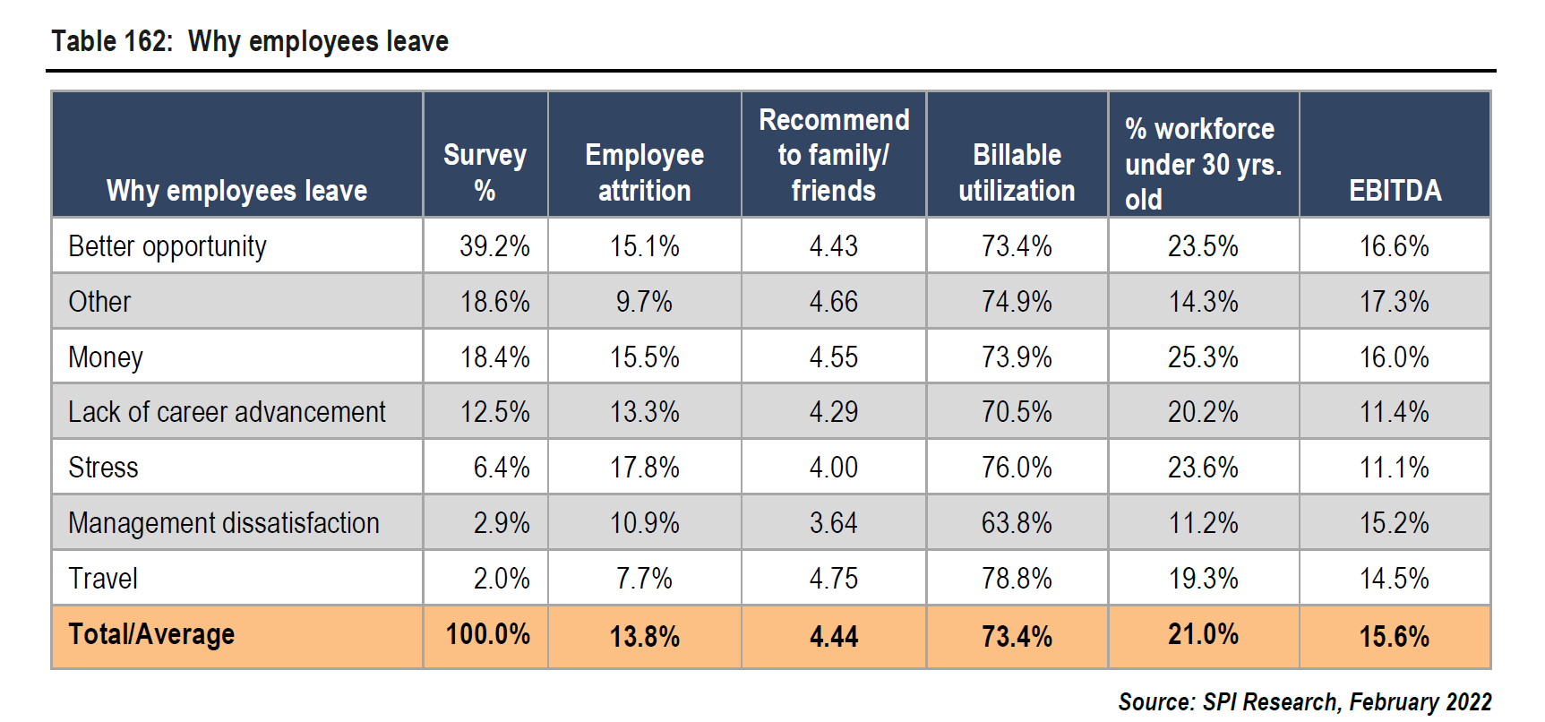 Although employees leave for a variety of reasons, there is typically a primary catalyst for moving on. Above in Table 162 from the 2022 SPI Professional Services Maturity Benchmark, you’ll see the top reasons why employees leave. 39.2% state that the number one reason is due to a “better opportunity” which translates to a better work environment, better compensation, better management, or more opportunity for advancement.