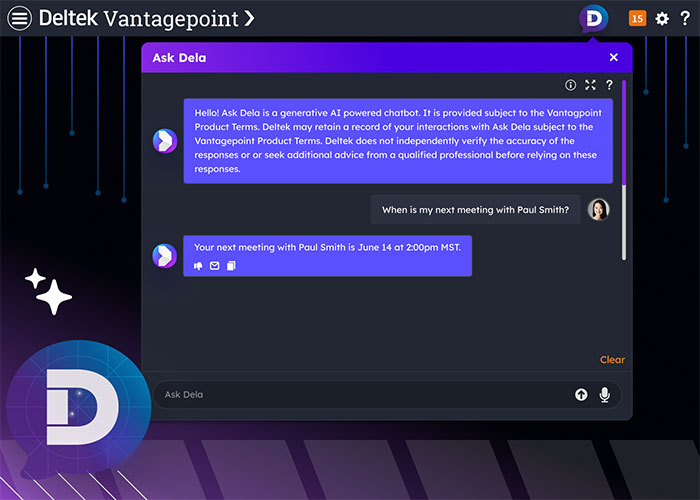 Ask Dela transforms the way you interact with your Vantagepoint data. Get ready to embrace the future with this revolutionary AI-powered digital assistant.